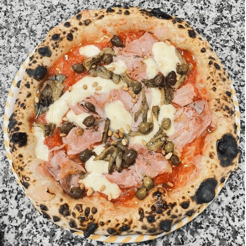 Margherita, jambon fines herbes, champignons persillés, olives taggiasches, après cuisson : huile d'olive, pignons de pins.